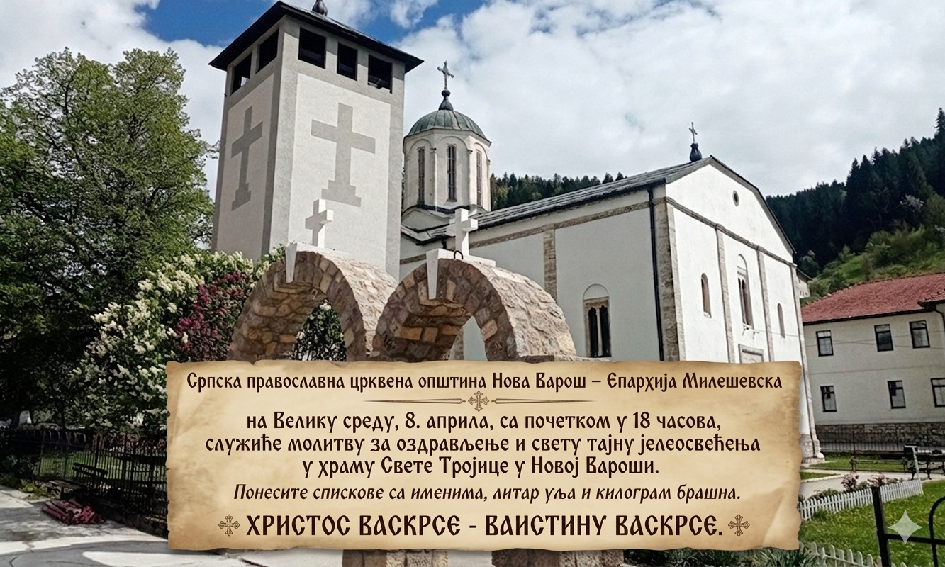 Srpska pravoslavna crkvena opština Nova Varoš - eparhija Mileševska na Veliku sredu, 8. aprila, sa početkom u 18 časova, služiće molitvu za ozdravljenje i svetu tajnu jeleosvećenja u hramu Svete Trojice u Novoj Varoši.