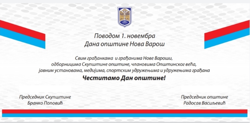 Ovo je zajednička čestitka kojom su predsednik opštine Nova Varoš Radosav Vasiljevići predsednik Skupštine opštine Branko Popović čestitali svim građanima Nove Varoši 1. novembar Dan opštine.